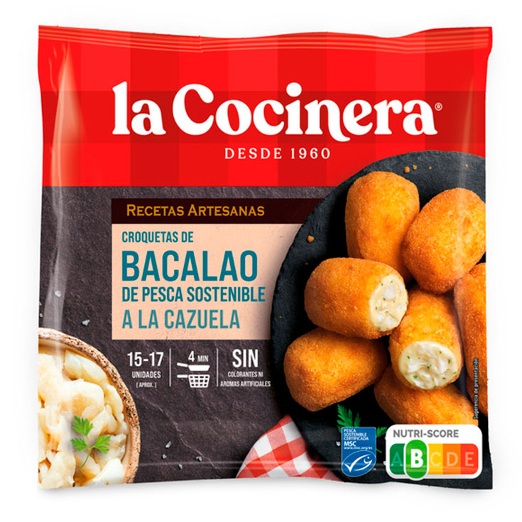 Agua, almidón de trigo, bacalao* seco desalado (12,8%), harina de trigo, leche desnatada en polvo, aceite de girasol, cebolla, sal, ajo, perejil, pimentón dulce, levadura. Puede contener trazas de crustáceos y moluscos. *Bacalao del Atlántico (Gadus morhua)/Bacalao del Pacífico (Gadus macrocephalus) / Bacalao de Groenlandia (Gadus ogac).