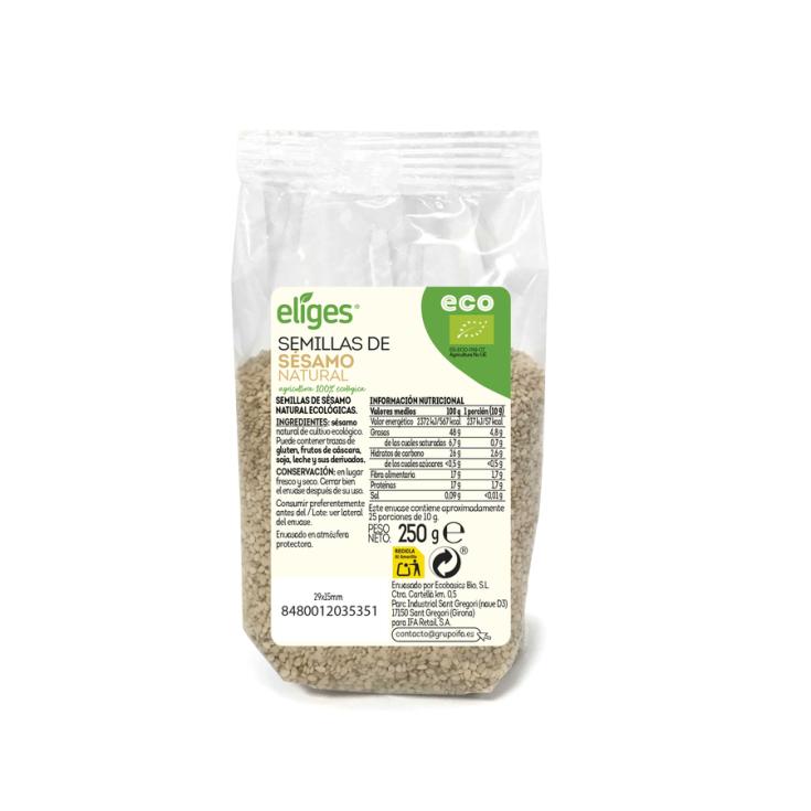 Sésamo natural*. *Producción ecológica. Puede contener trazas de gluten, frutos de cáscara, soja, leche y sus derivados.